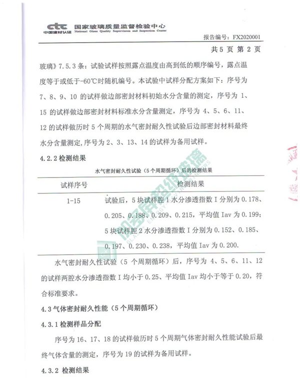 对于多屏中空传热系数等做的检测,国检中心检测报告给出的检测结论:“经检测,多屏中空尺寸偏差、外观质量、露点、耐紫外线辐照性能、初始气体含量、气体密封耐久性能、水气密封耐久性能符合GB/T11944-2010《中空玻璃》标准中的要求。其K值为0.56,露点为-60℃,可见光透射比(0.69)、太阳红外热能总透射比(0.49)、太阳能总透射比(0.49)、光热比(1.41)的测试,符合被动房玻璃在严寒地区标准。”本次报检的DPN多屏玻璃边部密封采用的是该公司产品生产的萨沃奇tpc暖边。