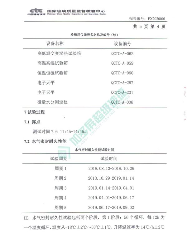 国检中心对多屏中空的5个气候循环检验,是在实验室摸拟自然界四季恶劣环境进行的,其流程繁琐、要求严厉、时间冗长。以水密封耐久性为例,分两个阶段:第一阶段要做56个循环,每12个小时为一个温度循环,这其中把样品放到实验箱里,温度从-18℃±2℃~53℃±1℃,升降温速率为14℃/h±2℃/h;第二阶段,把样品放在58℃±1℃温度下,从白天到晚上不停的喷水雾,然后放到露点仪冷却到零下60℃,看结不结雾,最后还要放在紫外线下照射,看密封胶是否有蠕变。按程序进行1个水密封耐久性能需用77天,5个共用了385天;1个气密封耐久性能需用42天,5个共用了201天。据悉:中空玻璃通过1个气候循环检验,寿命可达到15年,多屏中空通过了5个气候循环,寿命可达75年,创中空玻璃寿命之最。